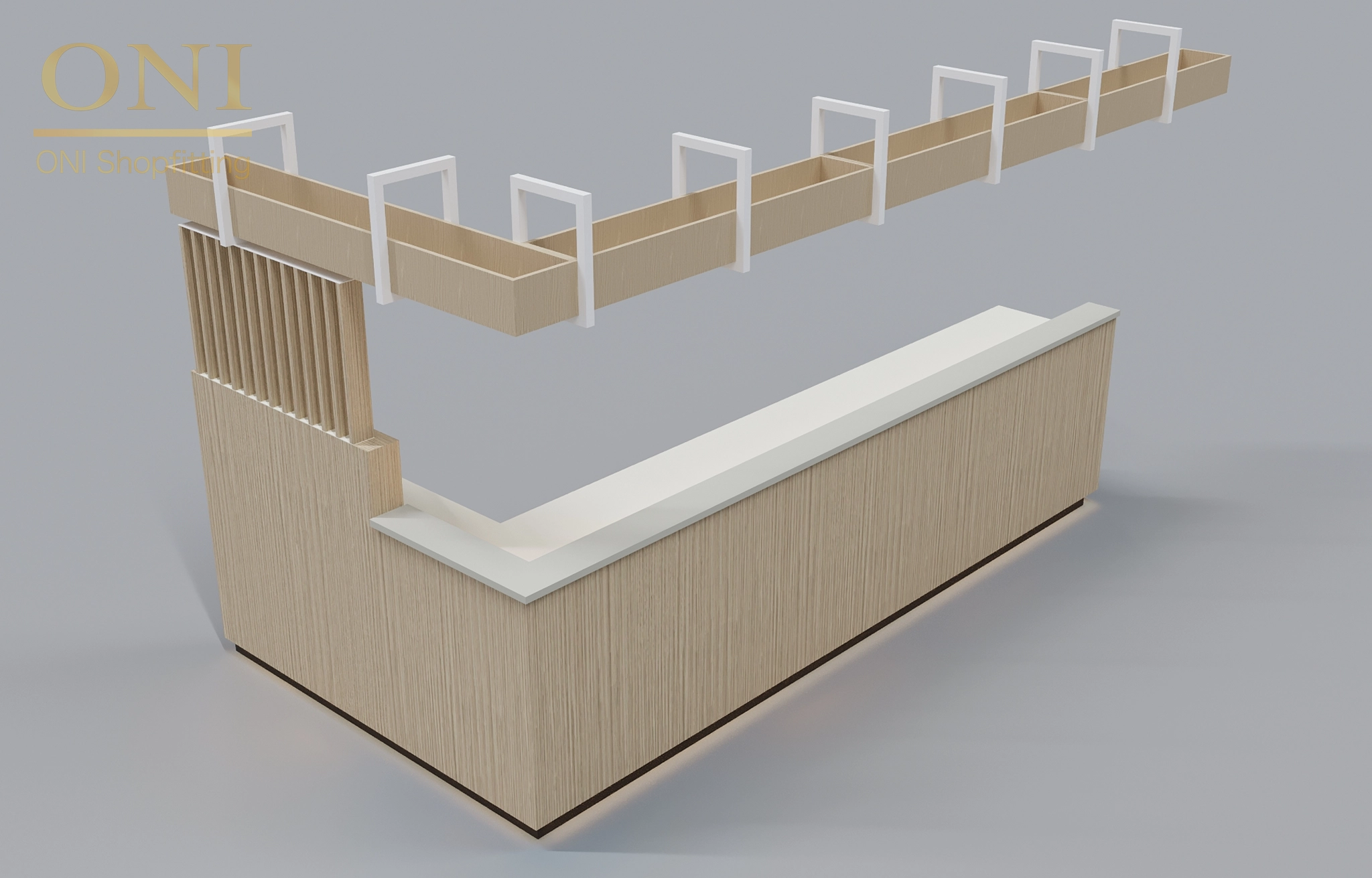 Show GG commercial space layout & style, core areas like reception desks/booths, conveying functional & aesthetic demands.