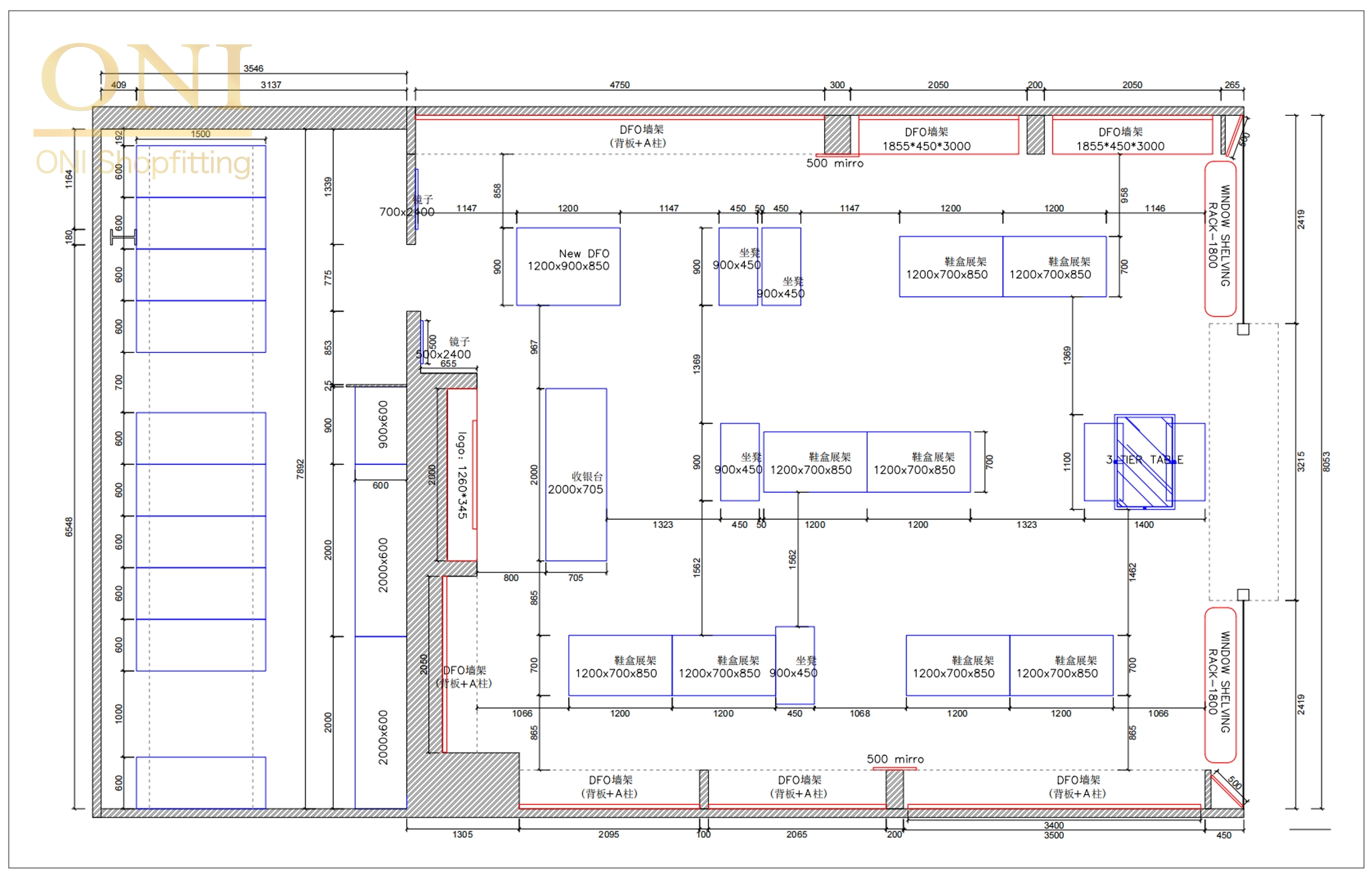 Selected client-provided drawings of shoe box displays, window displays and DFO wall racks, clarifying shoe store display functions & dimensions, conveying core display demands.