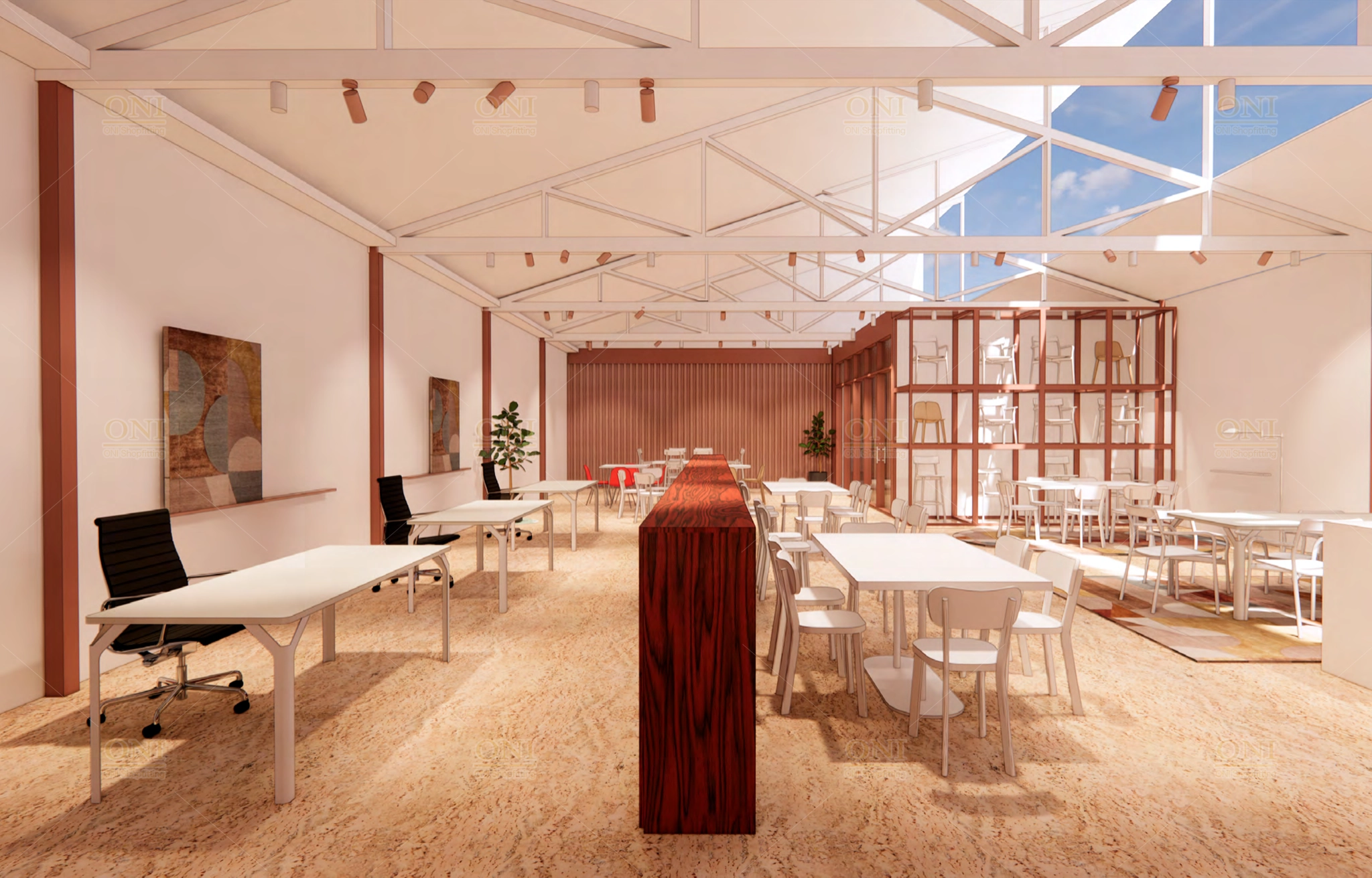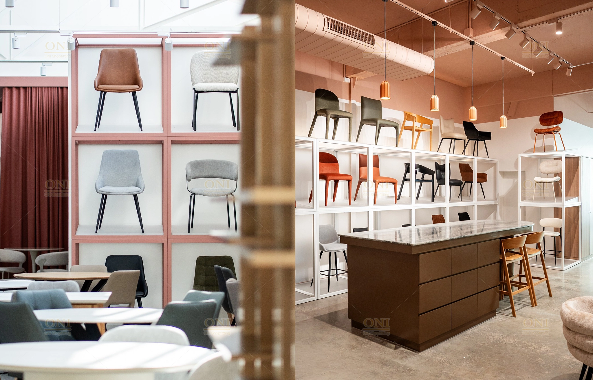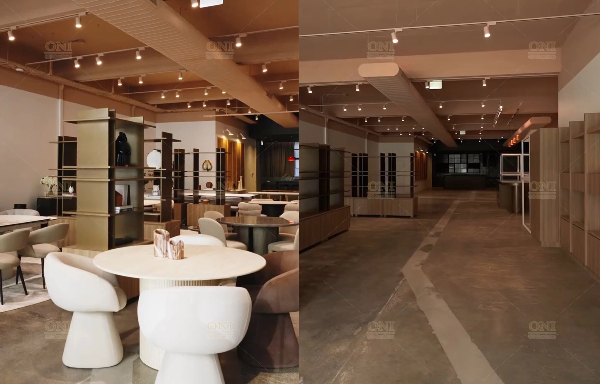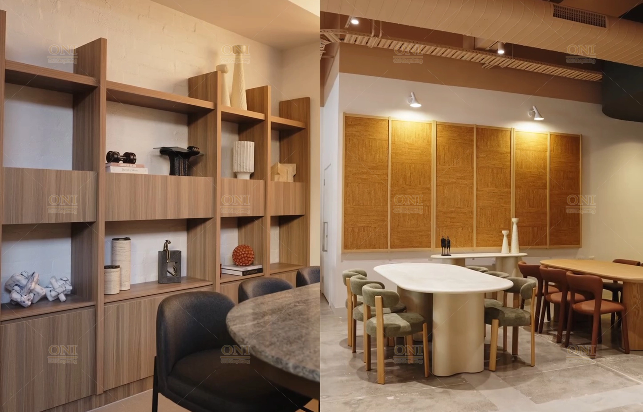 Display the finished scene of furniture showroom and office space, verifying the full implementation of turnkey customization from design to installation.