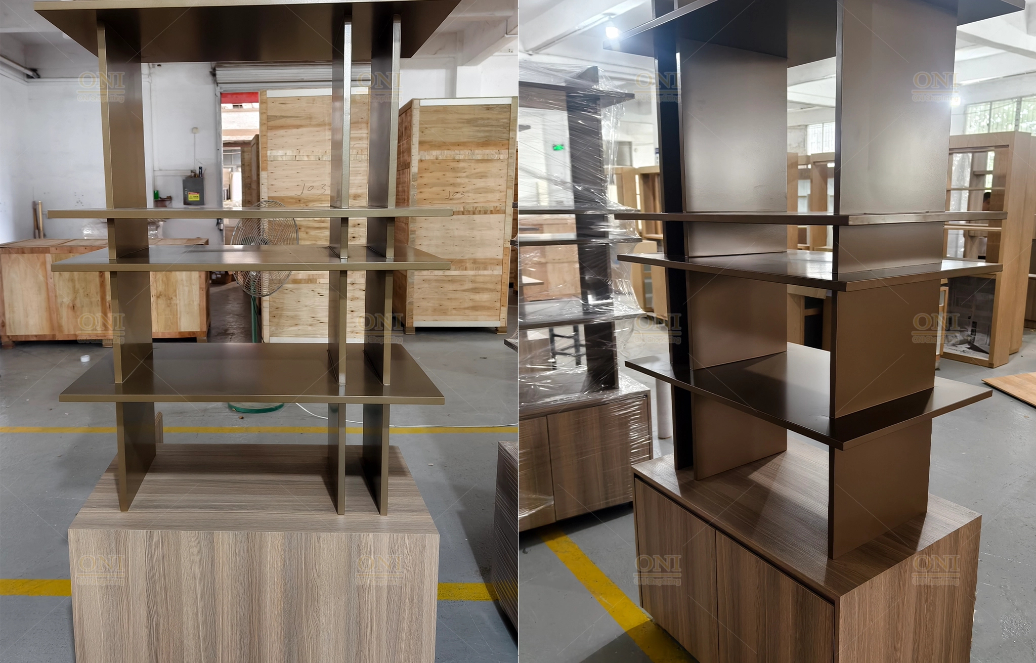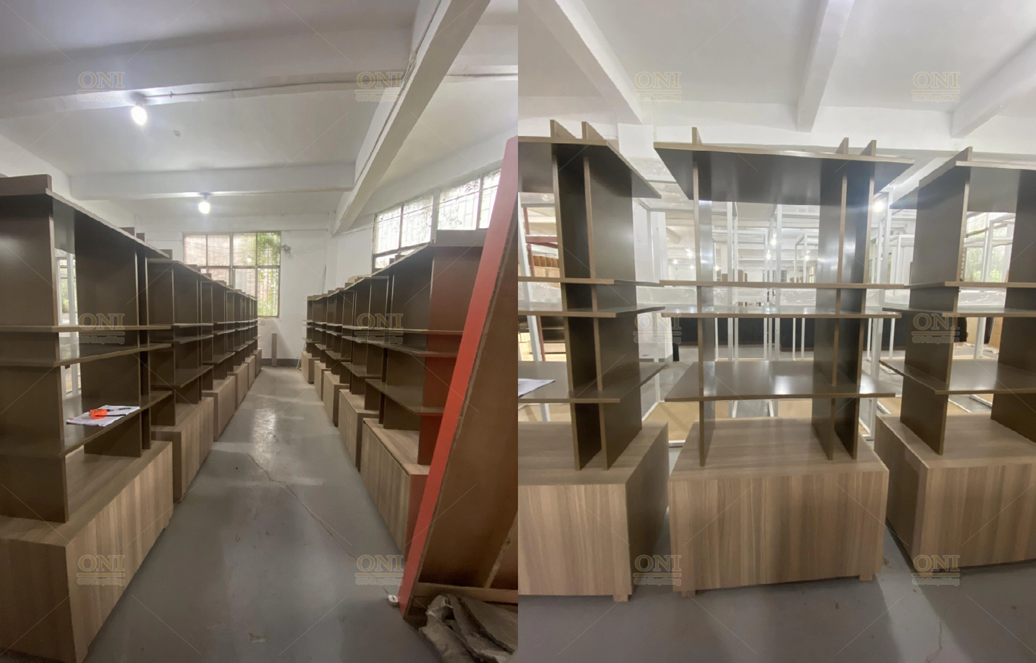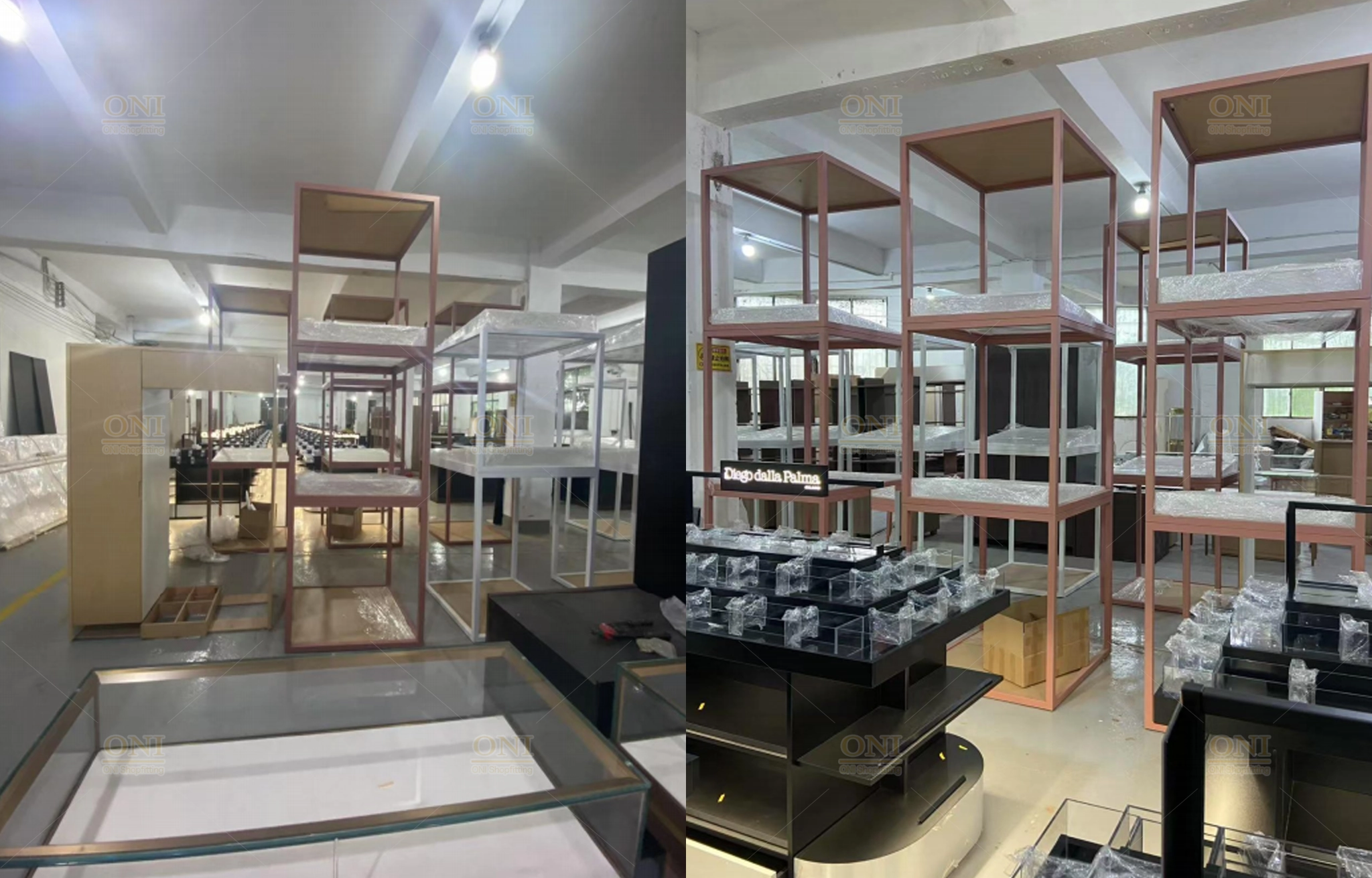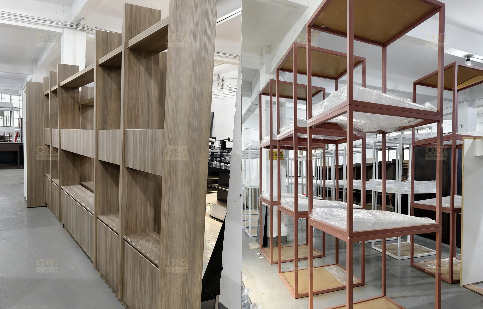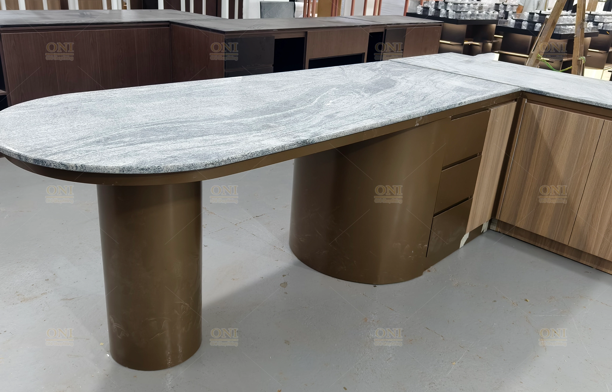 Display the finished scene of furniture showroom and office space, verifying the full implementation of turnkey customization from design to installation.