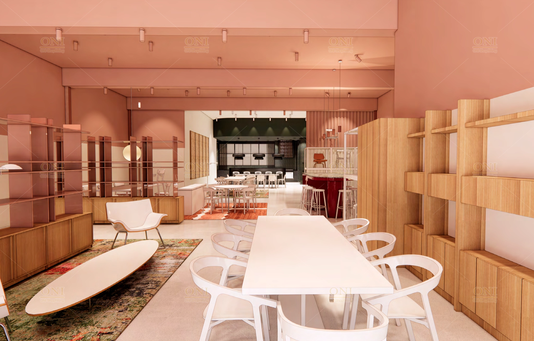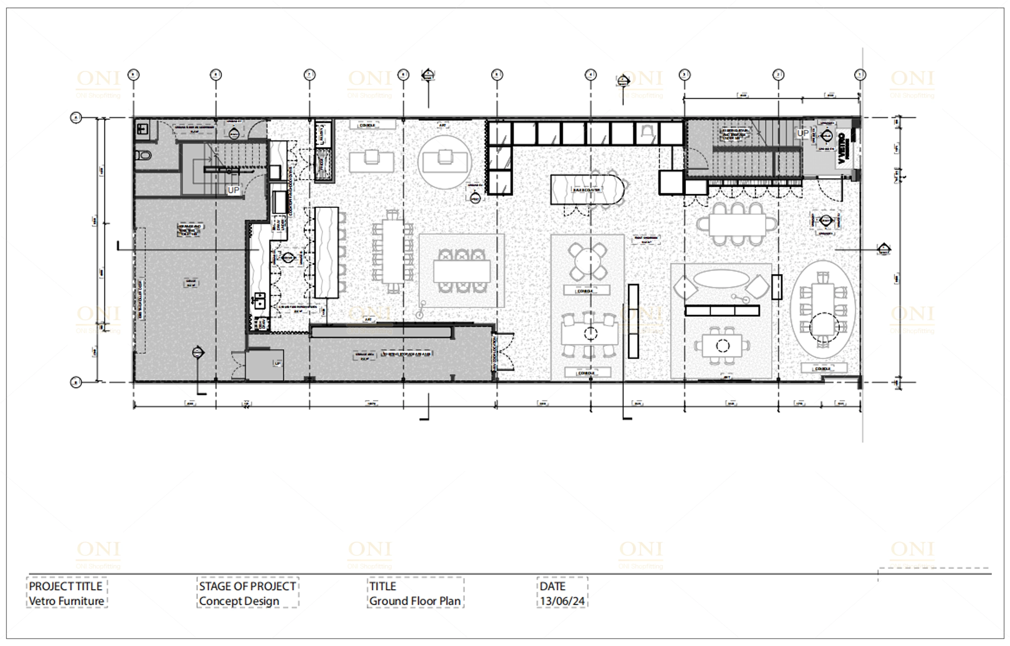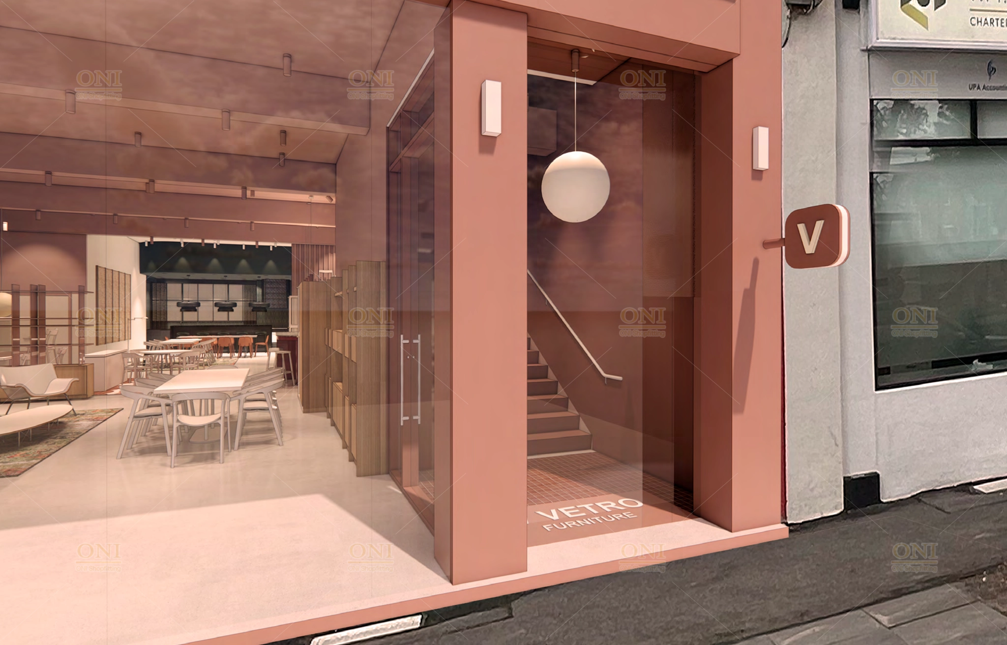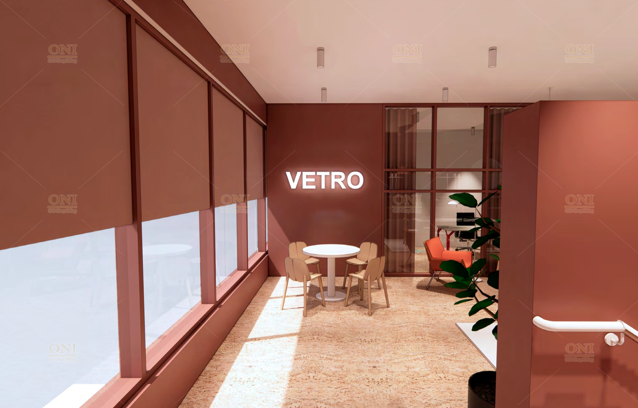 Present the overall layout, design style and functional zones of VETRO Furniture showroom & office space, clearly conveying core design demands.