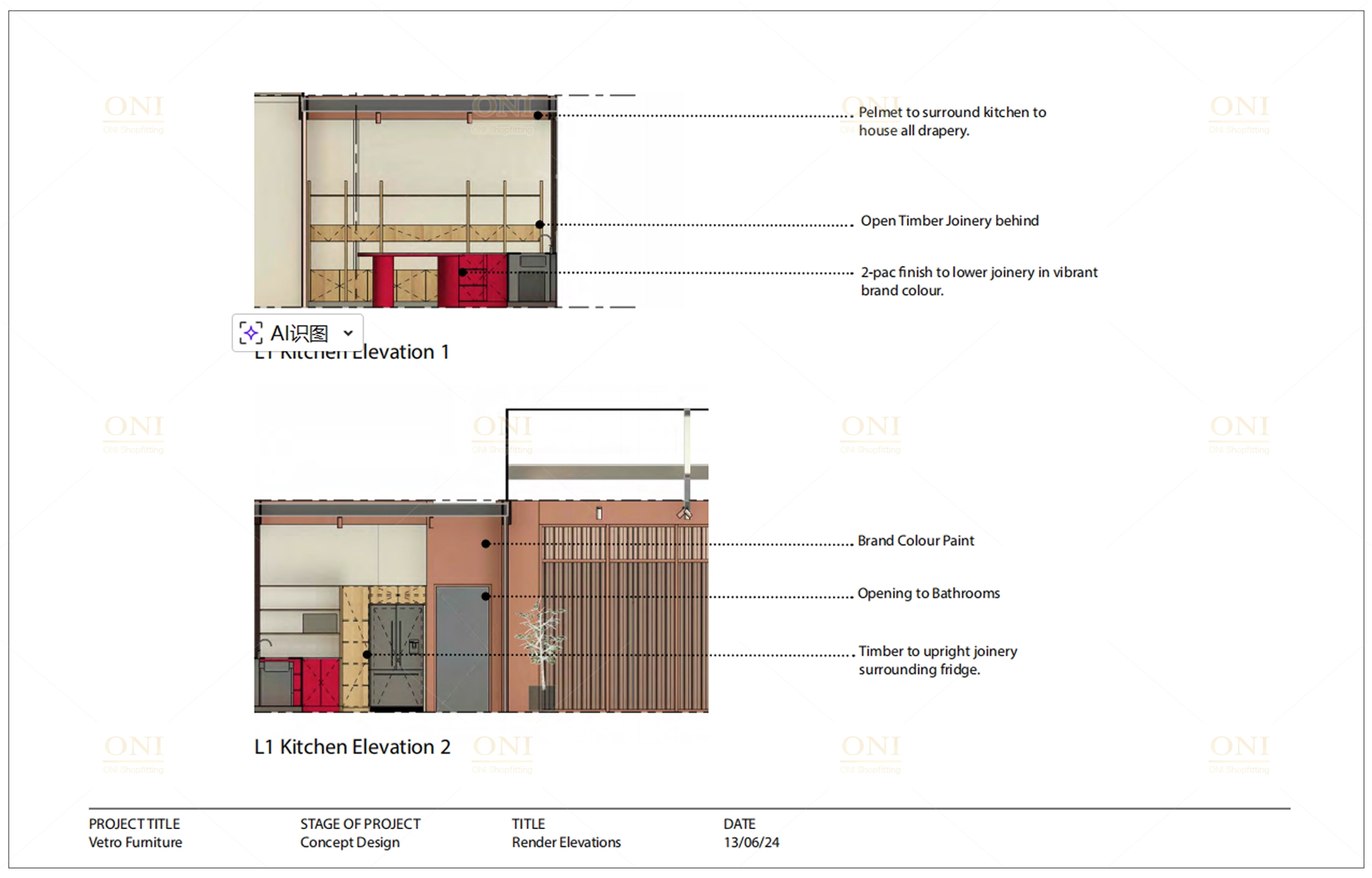 Select original design drawings of showroom, service counter, kitchen and office area, clarifying dimension specifications and functional planning.