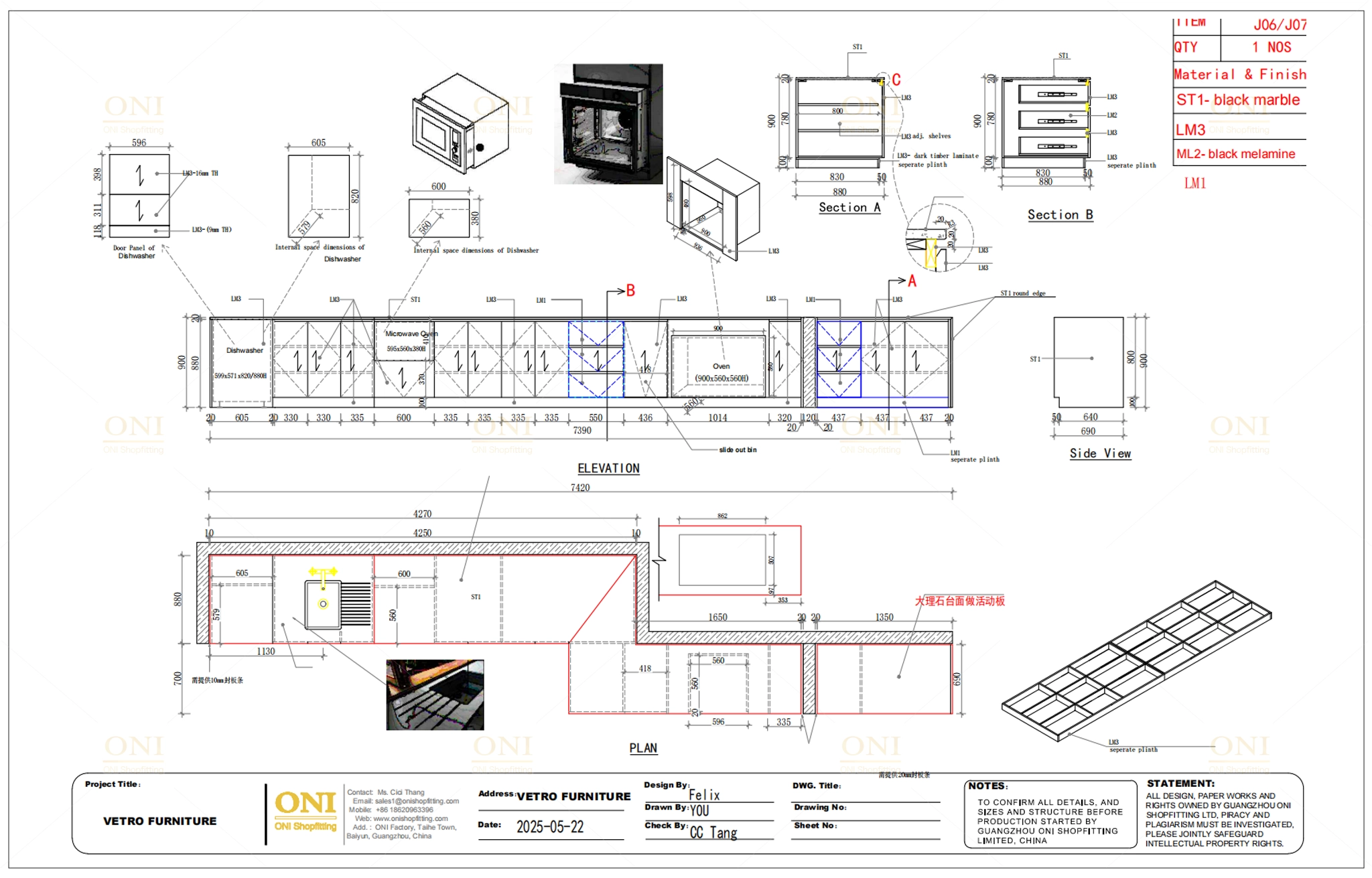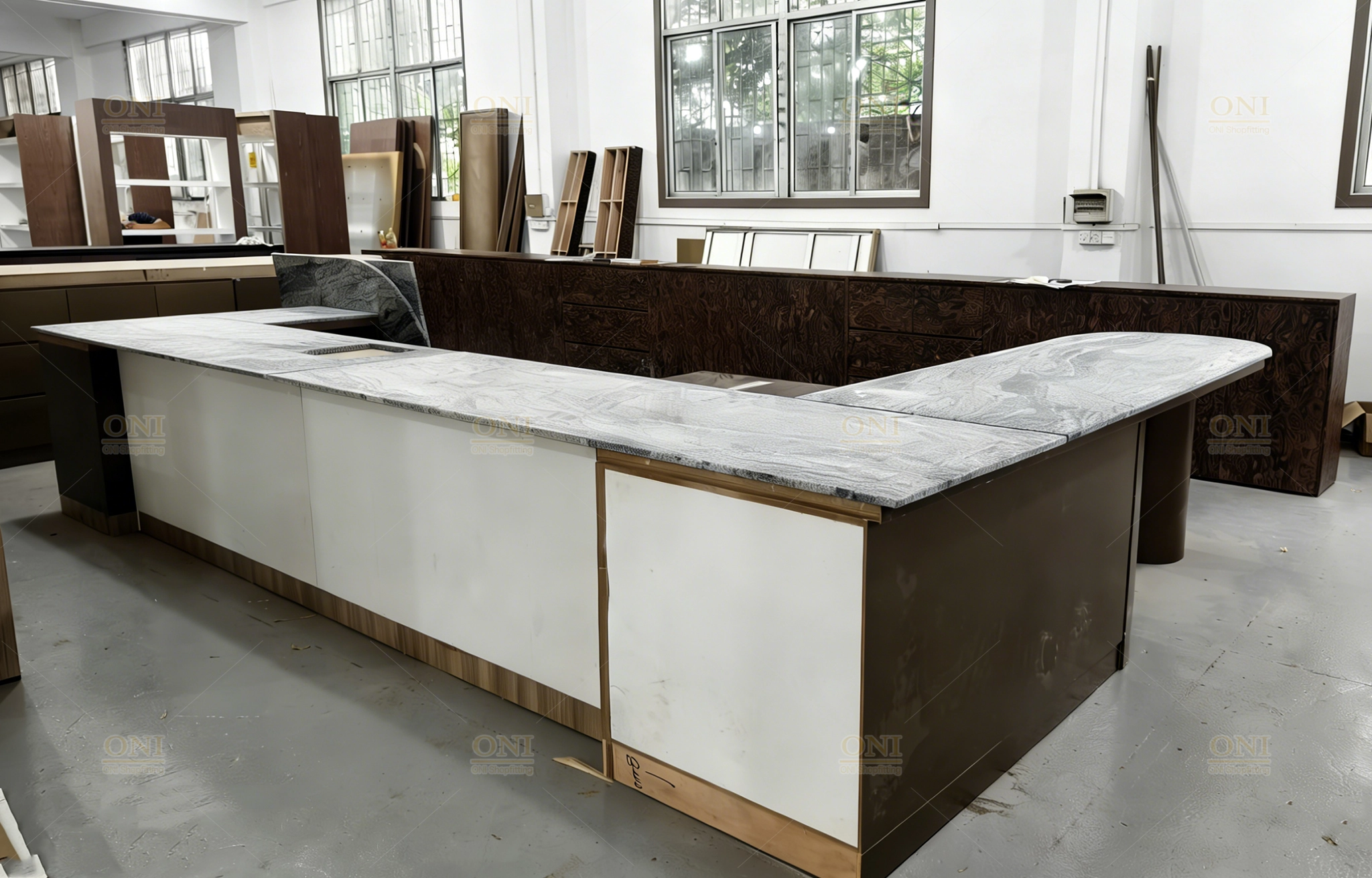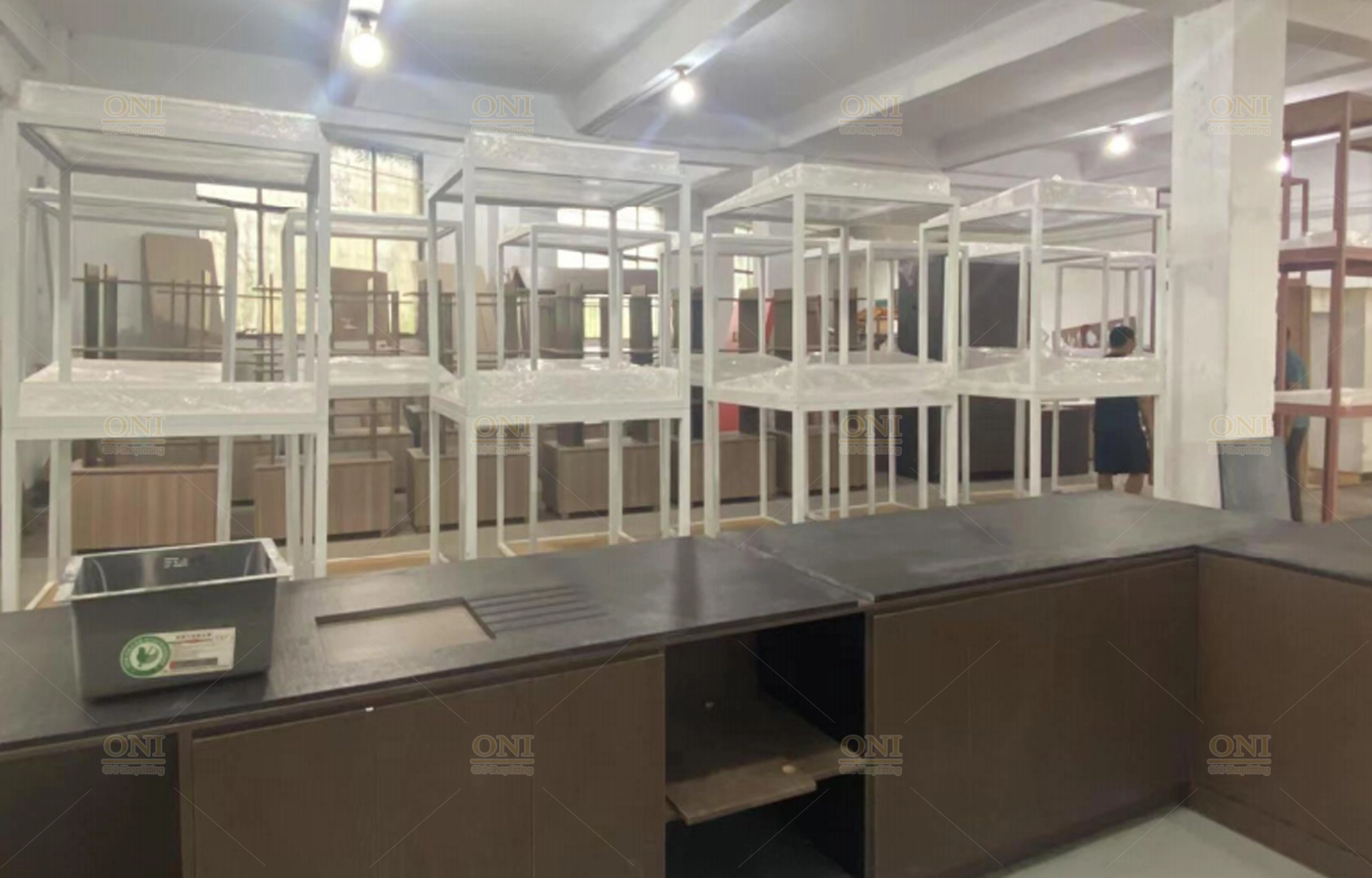 Focus on quality inspection of cabinet splicing, stone countertops and metal frames, showing Australian-standard material quality and standardized control.