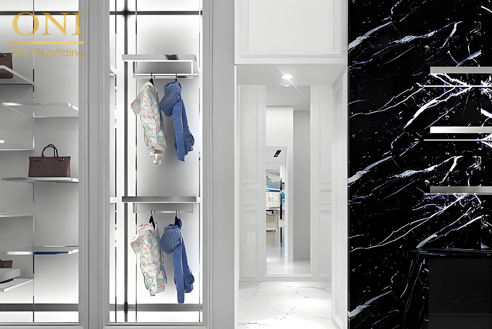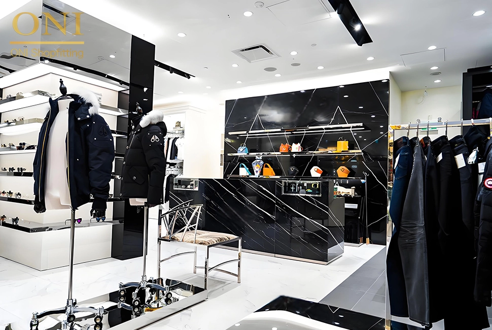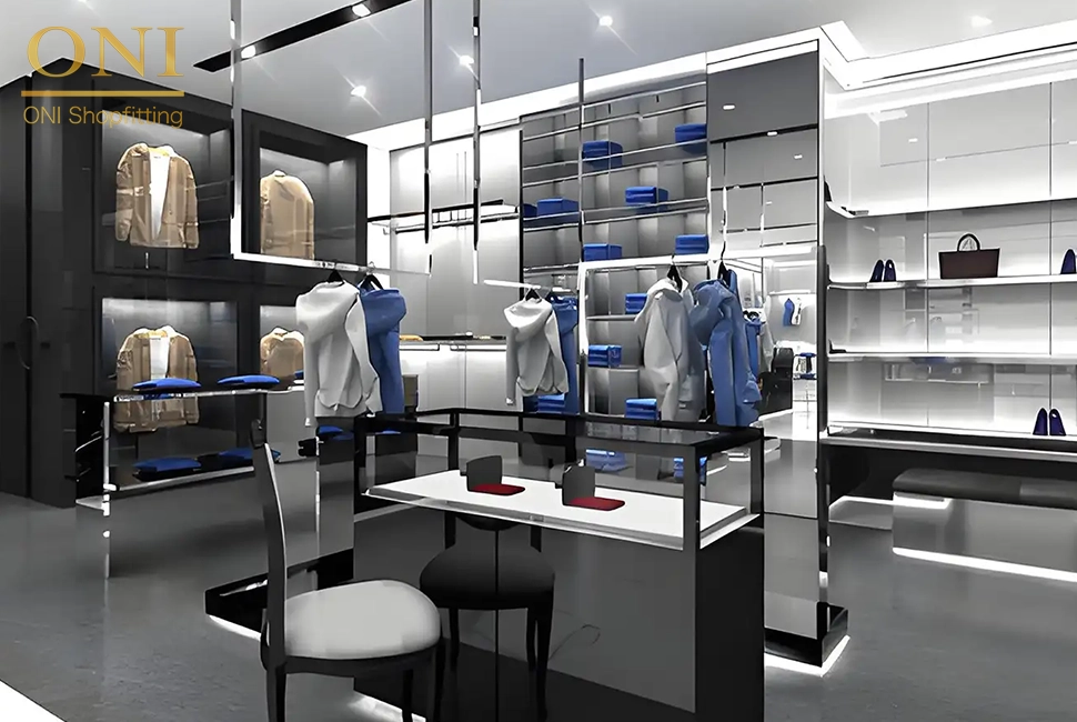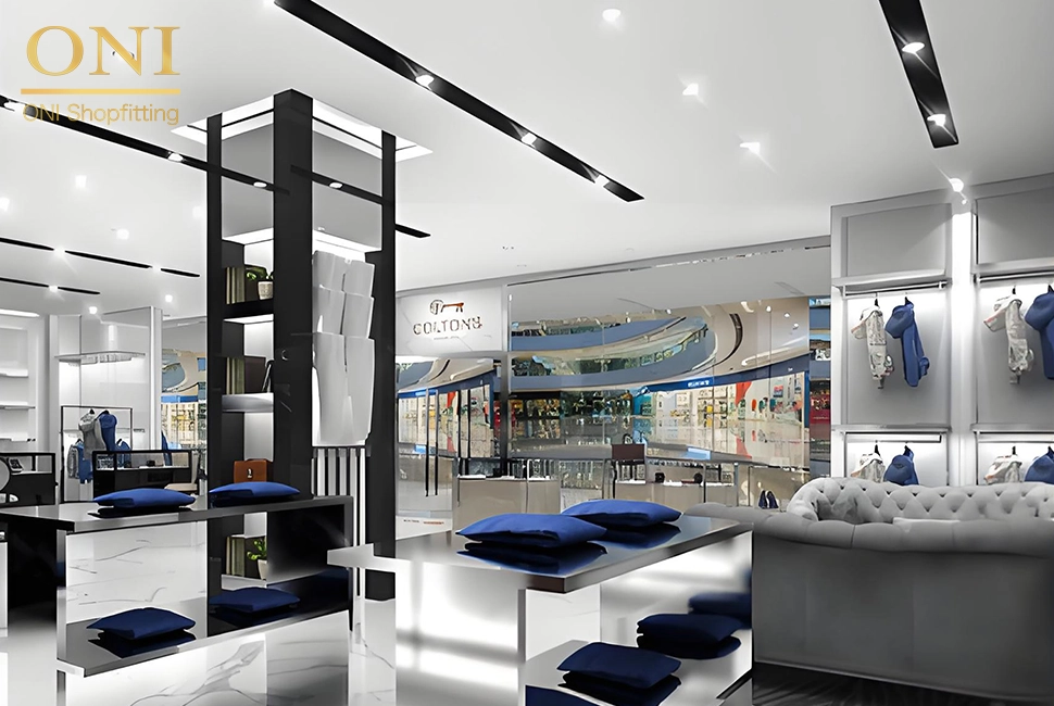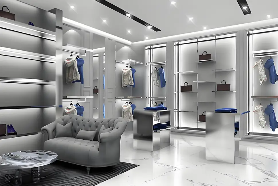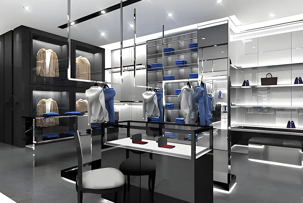 The store exudes a high-end and fashionable atmosphere, with clothing display racks and display facilities carefully arranged. Various clothes are displayed in an orderly manner in exclusive display areas, and with the comfortable rest area, each piece of clothing can fully show its own style, and it also creates a pleasant shopping environment for customers, stimulating their desire to try on and buy.