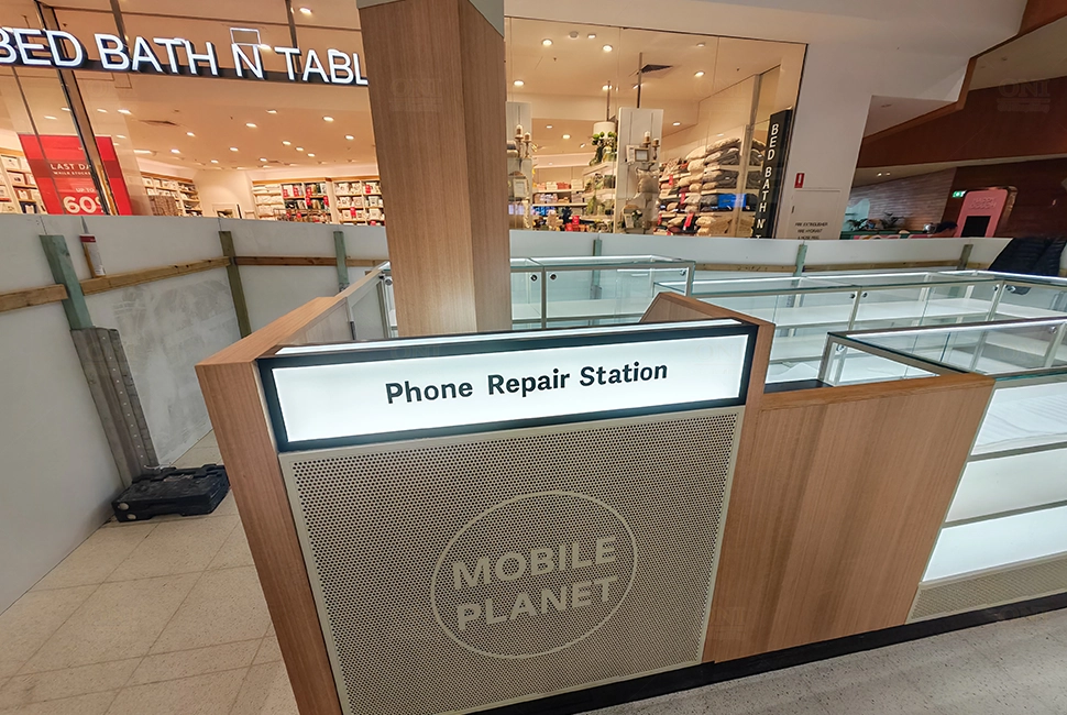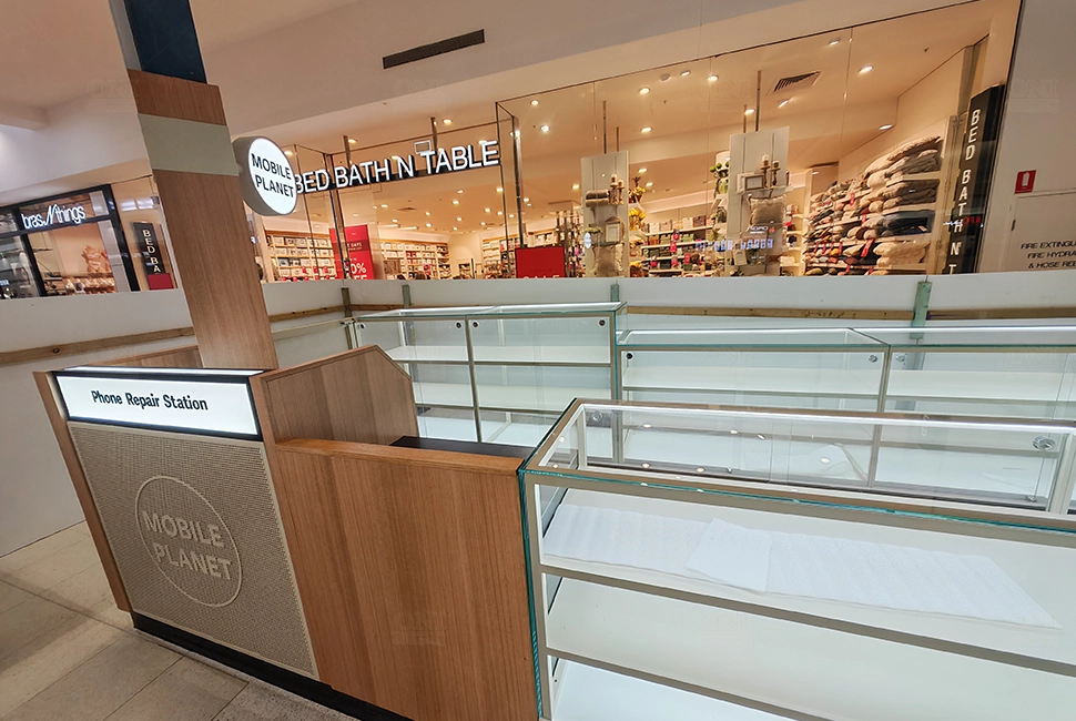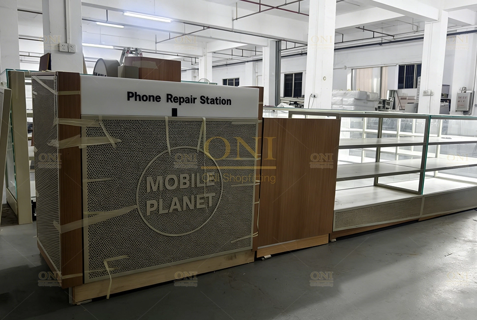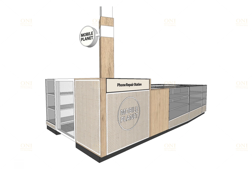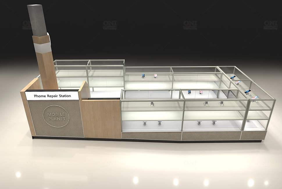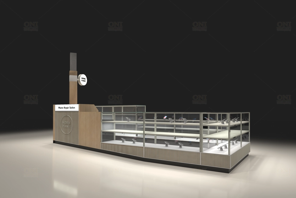 This phone repair kiosk project exudes a high-end and stylish modern atmosphere, with display cabinets and service facilities carefully planned: Transparent glass display cabinets paired with layered display areas present various mobile phone accessories in an orderly and exquisite manner; complemented by warm wood texture and embedded lighting, the exclusive repair workstation layout is clear, adapting to the open and bright mall space. Every accessory can fully show its detailed texture, while the neat and professional repair area also creates a pleasant consumption environment for customers, effectively stimulating their willingness to consult for repairs and purchase accessories.